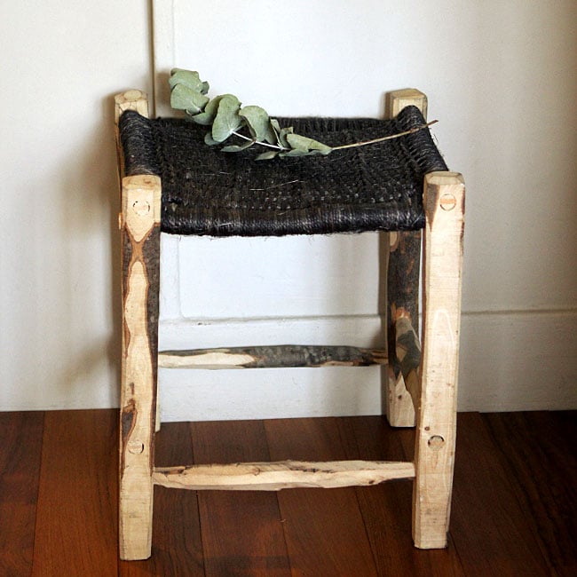 Tabouret traditionnel tunisien en bois d'olivier et chanvre noir. On le trimballe dans toute la maison comme siège d'appoint, table de chevet, jusque dans le jardin à l'heure de l'apéro.